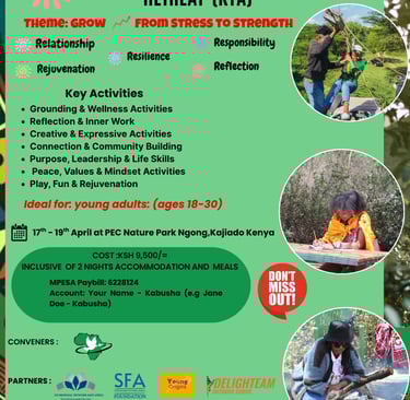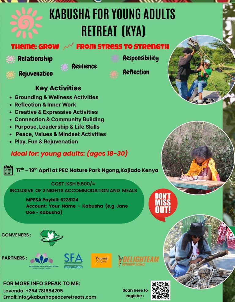 Are you a young adult (18–30) seeking a space to pause, breathe, and reconnect with yourself?Under the theme “From Stress to Strength,” the Kabusha Young Adults Retreat invites you into a transformative experience designed to help you find rest, clarity, and renewal in the midst of life’s demands.Whether you are navigating stress, life transitions, or feeling overwhelmed, this retreat offers a safe and supportive space to build resilience, strengthen your emotional intelligence, and rediscover your inner strength.Through reflection, nature-based experiences, and shared learning in community, you will gain practical tools and deeper self-awareness to help you move forward with confidence and purpose.