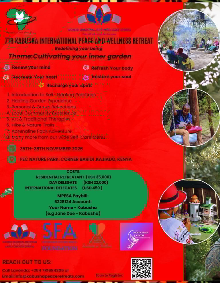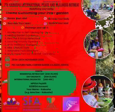 Are you a leader or changemaker seeking space to pause, reflect, and renew?Kabusha—meaning Rebirth— is a 3-day immersive Peace & Wellness Retreat designed to help you reconnect with your purpose and restore balance in your life and leadership.Since 2019, Kabusha has provided a sacred space for leaders to release the weight of responsibility and emerge renewed in body, mind, heart, and spirit, guided by the 5Rs: refreshing, restoring, renewing, recreating, and recharging.Through reflection, nature immersion, storytelling, and shared learning, you will gain the clarity, strength, and resilience needed to lead with intention and impact.